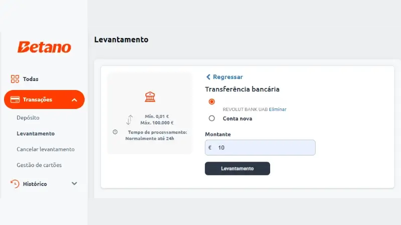 Na Betano os levantamentos têm prazos de tempo mínimo que variam consoante o método de pagamento que utilizar. Enquanto que transações feitas via transferência bancária têm um prazo de até 24h (normalmente), nas feitas com o Paysafecard o prazo máximo é de 1h.
